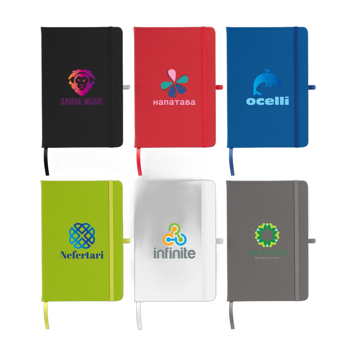 Introducing the Wilde Recycled Hard Cover Journal - A5 5.5" x 8.3", a practical and stylish choice suitable for both professionals and students. This journal features 80 sheets (160 pages) of 70 gsm paper sourced via responsible forestry in ivory color, each lined for easy writing and securely bound with glue. Its rounded edges provide a sleek, modern appearance. For added convenience, it includes a satin ribbon for effortless page marking, along with a functional elastic strap and pen loop on the back, accented with silver grommets. Show your brand's true colors with ColorJet, our full-color inkjet imprint process. Complies with Prop 65. 8.30" H x 5.59" W x 0.54" D