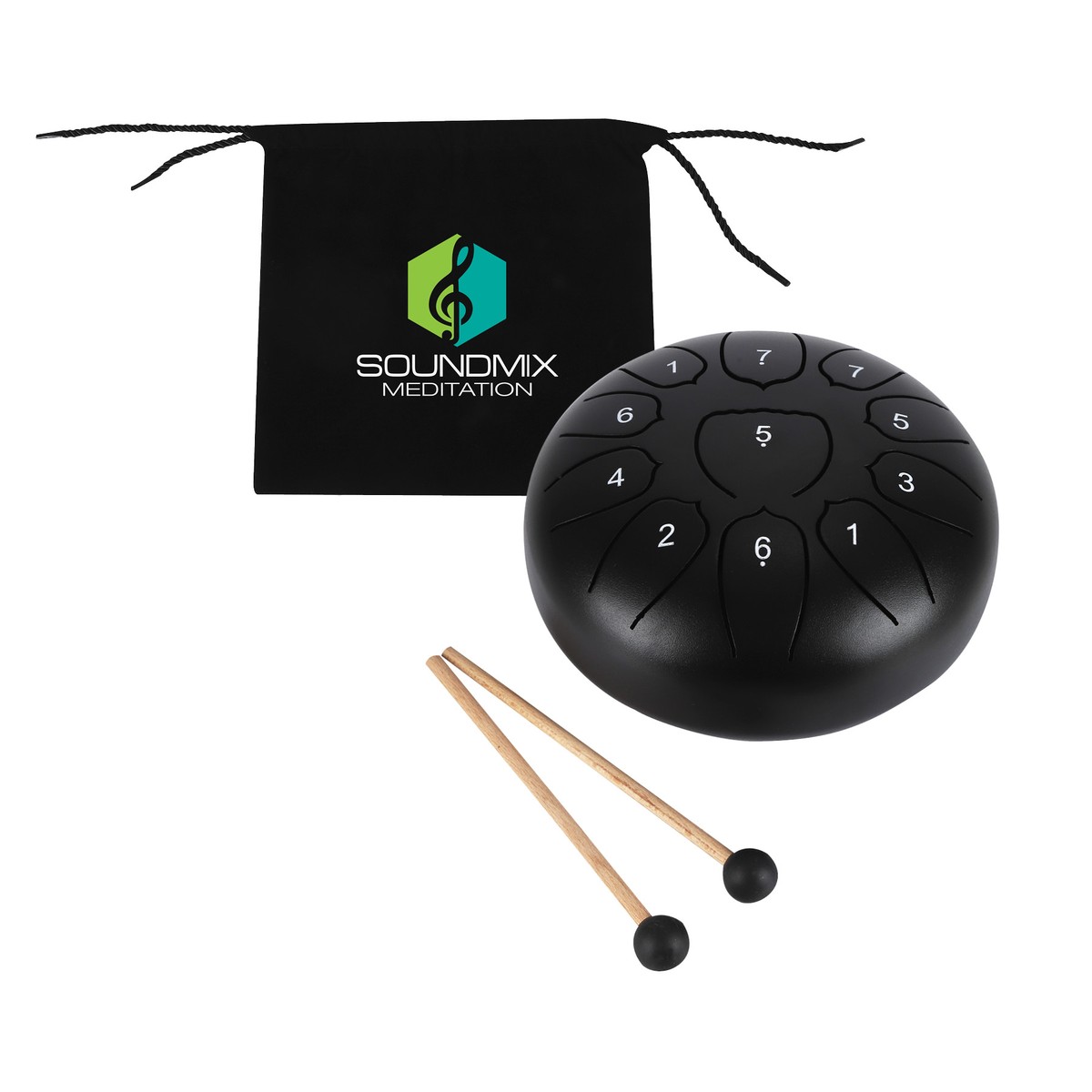 Discover the soothing sounds of the Willow Steel Tongue Drum. Tuned to a standard C key with 11 distinct notes, this unique gift offers a rich, melodic range. Perfect for meditation, music therapy, or casual play, this drum delivers a calming and expressive experience for players of all skill levels. It comes with two rubber mallet drumsticks designed for smooth, resonant strikes, a velvet storage bag to protect the instrument when not in use, and a 15-song music book to help guide beginners through their first rhythms and melodies. Let your creativity flow with the relaxing tones of this beautifully crafted percussion instrument. Complies with Prop 65. 6 3/16" W x 3 1/2" H x 6 3/16" D