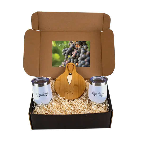 Two-piece gift set includes the Small Bamboo Cutting Board with Cheese Knife, and the set of Napa Wine Tumblers inside the kit to-gift-box.