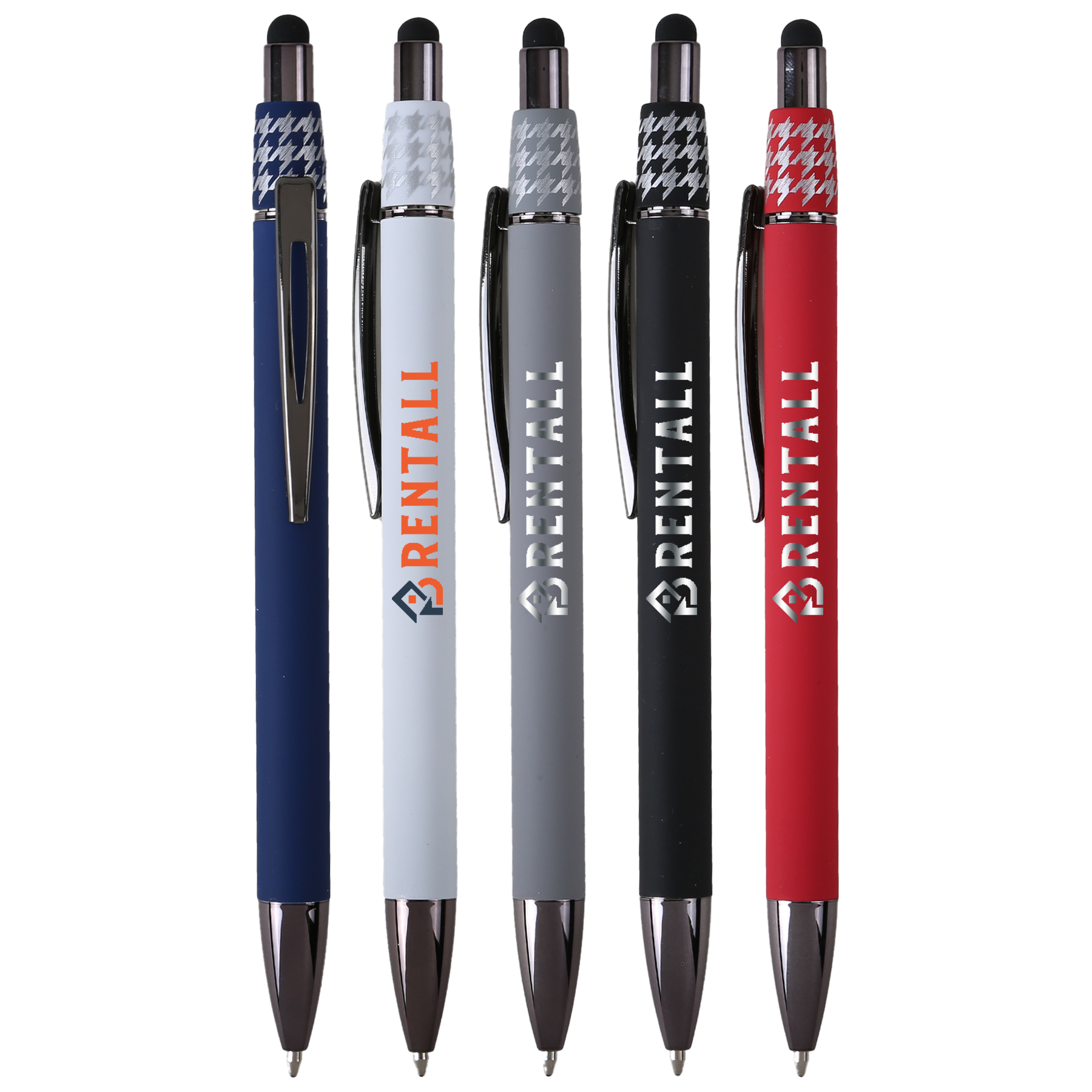 The Wizzard Comfort Stylus Spinner Pen seamlessly blends stress relief with an enjoyable writing experience. This executive metal pen features a stylish houndstooth pattern fidget spinner that effortlessly whizzes with a flick of a thumb. Paired with the matte soft-touch barrel and gunmetal trim, it creates the perfect promotional pen. Your brand will stand out with the large imprint area, and the smooth writing ink with push retraction ensures a joyous writing experience. Opt for the Wizzard Comfort Stylus, a distinctive, stress-relieving, and enjoyable tool that sets any brand apart. Material: Aluminum Standard Decoration Includes: Laser Engraving On Barrel All Available Decoration Options: Engraved: 2.5" W x 0.25" H Barrel Full Color: 3" W x 0.25" H Barrel (white pen only) Straight Line Copy: Yes Tip Type: Ball Point Mechanism: Push Action Standard Packaging: Bulk Patents: 9,950,556; 10,414,204 Tags: Ballpoint, Stylus, Pen, Writing, Tool, Ink, Touchscreen, Hybrid, Dual, Function, Multi-purpose, Digital, Device, Screen, Capacitive, Nib, Retractable, Click, Smooth, Convenience