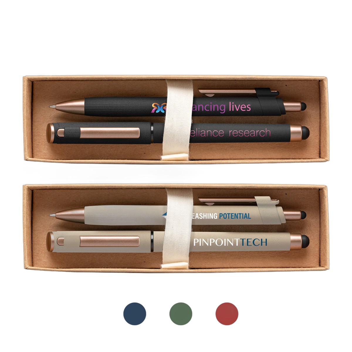 Discover the Bronze Trim Pen Set with FSC Gift Box—a refined writing duo that blends elegance with responsibility. This set features a gel pen with cap and a retractable ballpoint pen, both crafted with a unique stone-like texture and accented with warm bronze trim. The entire set, including the recyclable FSC-certified kraft paper gift box, is beautifully decorated with . The ALM cap gel pen offers smooth ink flow in black, while the ALN retractable ballpoint pen ensures crisp, reliable writing. This duo is perfect for holiday programs, or elevated promotional campaigns. 2.05" H x 7.01" W x 1.41" D