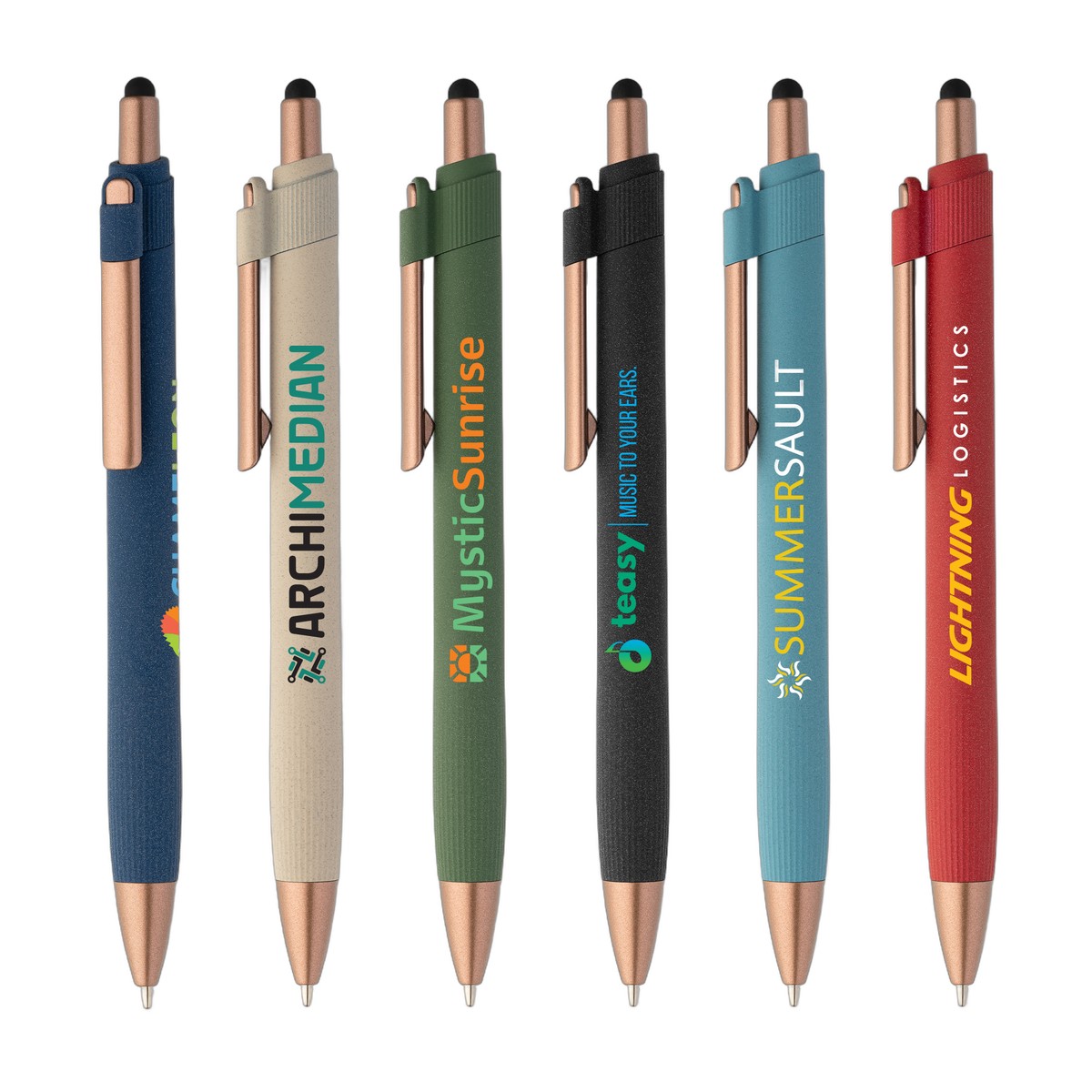Experience the pinnacle of sophistication with the York Recycled Plastic Bronze Trim Stylus Ballpoint Pen. Crafted from branded recycled ABS plastic, its barrel boasts a luxurious stone-painted finish, beautifully accented by elegant matte bronze trims. Navigate the digital world effortlessly with the integrated black rubber stylus, while the slim 1.0mm ballpoint refill, filled with long-lasting Dokumental black ink, delivers a remarkably smooth and consistent 600-meter write-out. Available in rich, nature-inspired hues—Red, Forest, Sage, Navy, Stone, and Black—the York Pen masterfully blends refinement with responsibility, making it the perfect choice for elevated branding that truly inspires. 5.75" W x 0.44" D