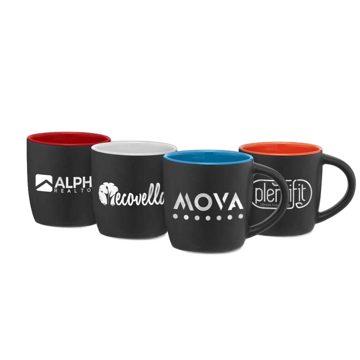 Sip from a successful marketing campaign! Our 12-ounce Matte Black Ceramic Mug with ColorPop offers a modern approach to branding. Make your message even more eye-catching with a unique high gloss inner mug pop of color in white, red, light blue, and orange. . Complies with Prop 65. 3.62" H x 3.58" W