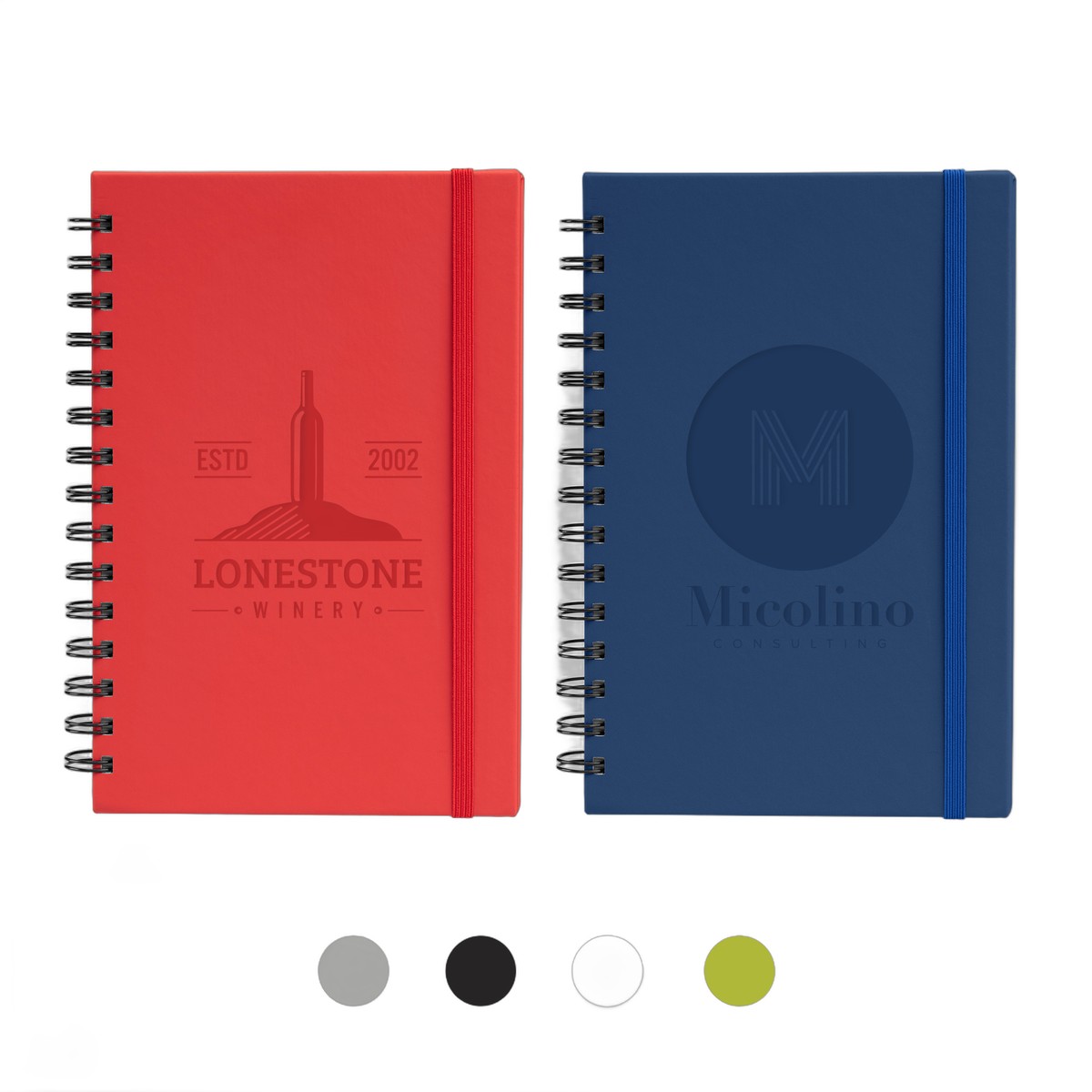 Introducing the Zelda Spiral Journal - an A5 Spiral Bound Journal featuring a hard cover crafted from recycled PU and craft paper, bound with a black metal double spiral, and includes a matching elastic band affixed to the back. It contains 96 sheets (192 pages) of 70gsm white Paper sourced via responsible forestry with collegiate lines, rounded corners. Complies with Prop 65. 8.27" H x 5.51" W x 0.59" D