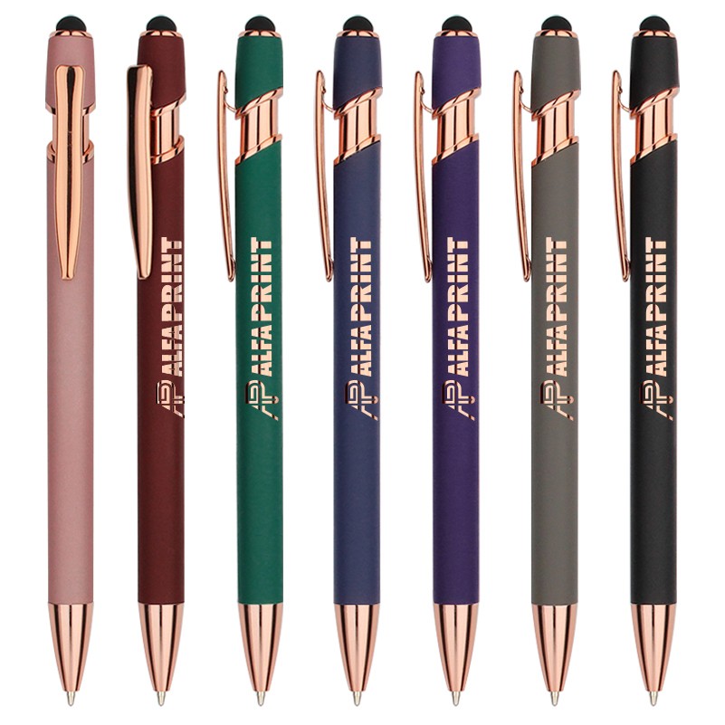 Ombre Soft Touch Rubber Rose Gold Metal Pen & Stylus with rose gold trim & engraves in rose gold to match the trim is a classy promotional pen. A classy slim style click action mechanism with a rubberized stylus. Standard ballpoint ink cartridge for writing on most surfaces. The stylus is compatible with all of today's tablets & smart phones. 3 lines of laser engraving. AVAILABLE WITH BLACK WRITING INK ONLY. Full color imprint available. Complies with Prop 65.