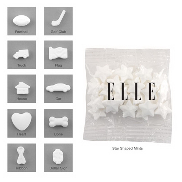 Present your valued customers, potential clients or dedicated employees with a bountiful candy bag of tasty treats! Filled with shaped mini mints, these darling "Thank You" gifts would be ideal for charity fundraisers, tradeshows and corporate picnics. Have your name or logo printed on the gold, clear or silver background and create a personalized addition to your next holiday gift basket. Mint shapes available in bone, car, house, dollar sign, flag, golf club, star, ribbon, football and truck.