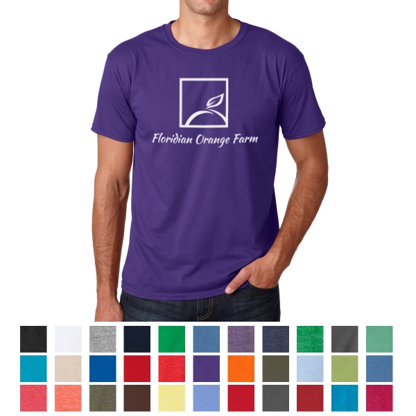 This Gildan SoftStyle® adult t-shirt is made from preshunk 100% ring-spun cotton jersey knit (blended cotton/polyester in heather colors). This tee features a 4.5 oz. seamless double-needle 3/4" collar, taped neck and shoulders, double-needle sleeve and bottom hems, and rolled-forward shoulders for a better fit. It is quarter-turned to eliminate a center crease. Select colors are available up to 3XL. Machine wash warm inside out with like colors. Use non-chlorine bleach only if needed. Tumble dry medium. Do not iron or dry clean. Please note, apparel cost changes weekly. Orders that have entered production cannot be cancelled.