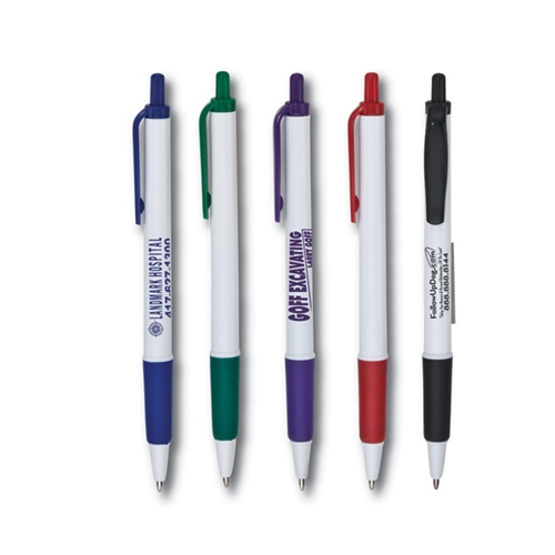 This retractable pen is a classic promotional pen. This is great giveaway pen. Very classic look, with it's matching grip, imprint, clip and clicker