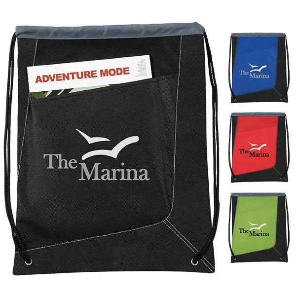 Exclusive. Atchinson (R). An Edge Above. Non-Woven Polypropylene. Trapezoid Cinchpack. Make carrying multiple loose items a "cinch" with this new Trapezoid Cinchpack. This appealing bag is both lightweight and flexible with drawstring closure and easily accessable front slip pocket. Drawstring closure. Angled front slip pocket. \nReinforced grommet detail. Product Size: 14" w x 18 1/4" h.